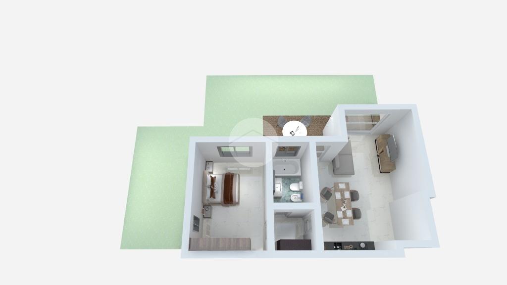 L’ingresso si apre direttamente nella moderna zona living con cucina a vista in affaccio sulla veranda, ideale per essere arredata con mobili da esterno e sul giardino di 60 mq circa.